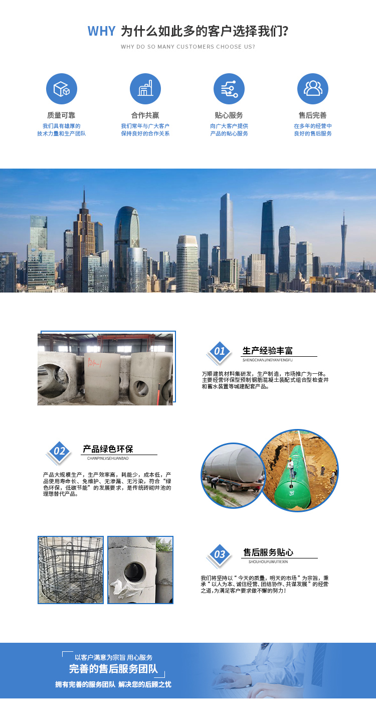 黃山市萬順建筑科技有限公司是集研發,生產制造,市場推廣為一體的綜合性企業。公司主要經營環保型預制鋼筋混凝土裝配式組合型檢查井和蓄水裝置等城建配套產品。產品生產過程采用獨特的生產工藝,機械化流水作業。產品大規模生產,生產效率高,耗能少,成本低,產品使用壽命長、免維護、無滲漏、無污染,符合“綠色環保,低碳節能”的發展要求,是傳統磚砌井池的理想替代產品。